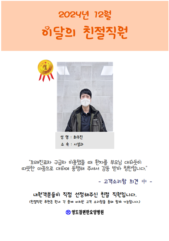 [안내] 2024년 12월 친절직원 선정 본문 우리 병원에서는 원내 각 층에 비치되어 있는 고객소리함을 통해 매달 친절 직원을 선정하고 있습니다.최상의 의료서비스를 제공하기 위해 더욱 더 노력하는 영도참편한요양병원 직원들이 되겠습니다. 이전글 목록 다음글