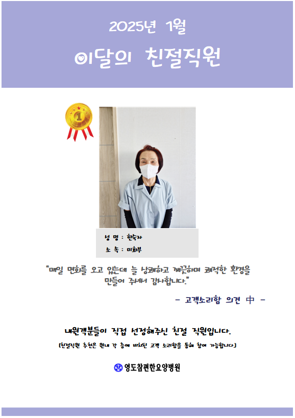 [안내] 2025년 01월 친절직원 선정 본문 우리 병원에서는 원내 각 층에 비치되어 있는 고객소리함을 통해 매달 친절 직원을 선정하고 있습니다.최상의 의료서비스를 제공하기 위해 더욱 더 노력하는 영도참편한요양병원 직원들이 되겠습니다. 이전글 목록 다음글