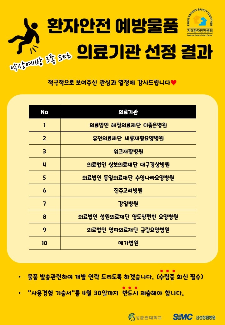 [안내] 지역환자안전센터 환자안전 예방물품 의료기관 본원 선정 본문 지역환자안전센터에서 경상권 지역의료기관을 대상으로 실시한 환자안전 예방물품(낙상예방 3종 set) 의료기관 선정 신청에 본원이 선정되었습니다.직무기술을 포함한 신청서로 신청한 수십개의 기관중에 10개 기관중에 본원이 선정됬으며 앞으로 환자안전에 대한 적극적인 활동을 다 같이 할 수 있도록 더욱더 힘쓰도록 하겠습니다. 이전글 목록 다음글