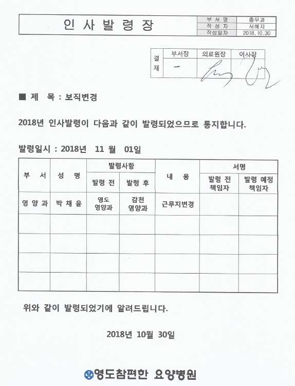 위와 같이 직원의 인사 발령을 공고합니다.