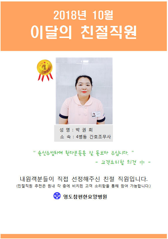 [안내] 2018년 10월 친절직원 선정 본문 우리 병원에서는 원내 각 층에 비치되어 있는 고객소리함을 통해 매달 친절 직원을 선정하고 있습니다. 최상의 의료서비스를 제공하기 위해 더욱 더 노력하는 영도참편한요양병원 직원들이 되겠습니다. 이전글 목록 다음글