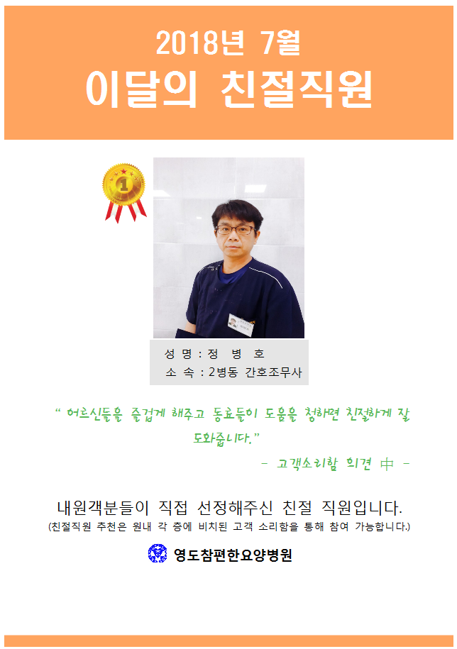 우리 병원에서는 원내 각 층에 비치되어 있는 고객소리함을 통해 매달 친절 직원을 선정하고 있습니다.