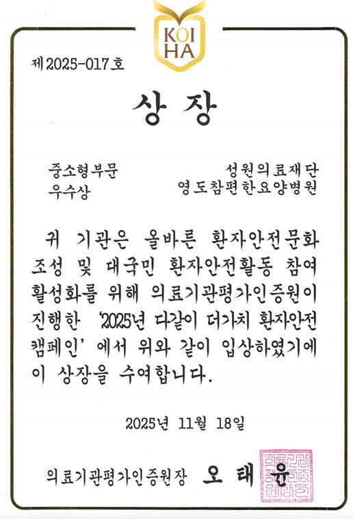 항상 환자안전을 위해 노력하는 영도참편한요양병원이 되겠습니다. 감사합니다.^.^