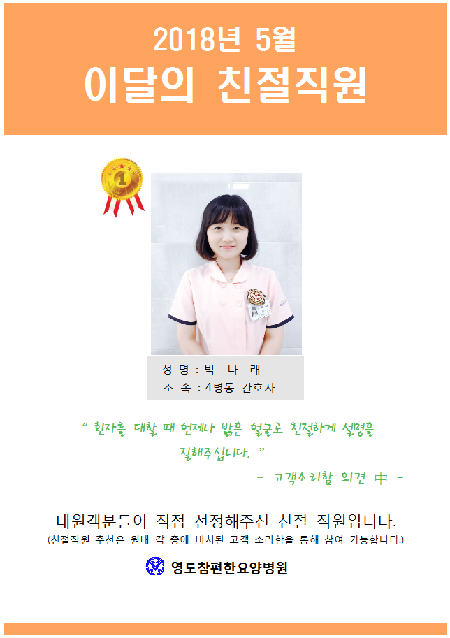 [안내] 2018년 5월 친절직원 선정 본문 우리 병원에서는 원내 각 층에 비치되어 있는 고객소리함을 통해 매달 친절 직원을 선정하고 있습니다. 최상의 의료서비스를 제공하기 위해 더욱 더 노력하는 영도참편한요양병원 직원들이 되겠습니다. 이전글 목록 다음글