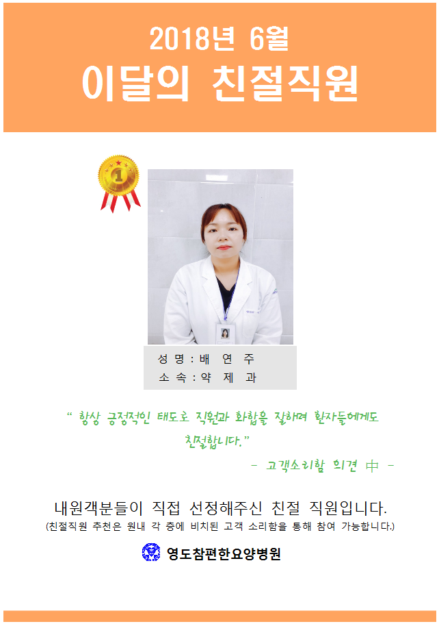 [안내] 2018년 6월 친절직원 선정 본문 우리 병원에서는 원내 각 층에 비치되어 있는 고객소리함을 통해 매달 친절 직원을 선정하고 있습니다. 최상의 의료서비스를 제공하기 위해 더욱 더 노력하는 영도참편한요양병원 직원들이 되겠습니다. 이전글 목록 다음글