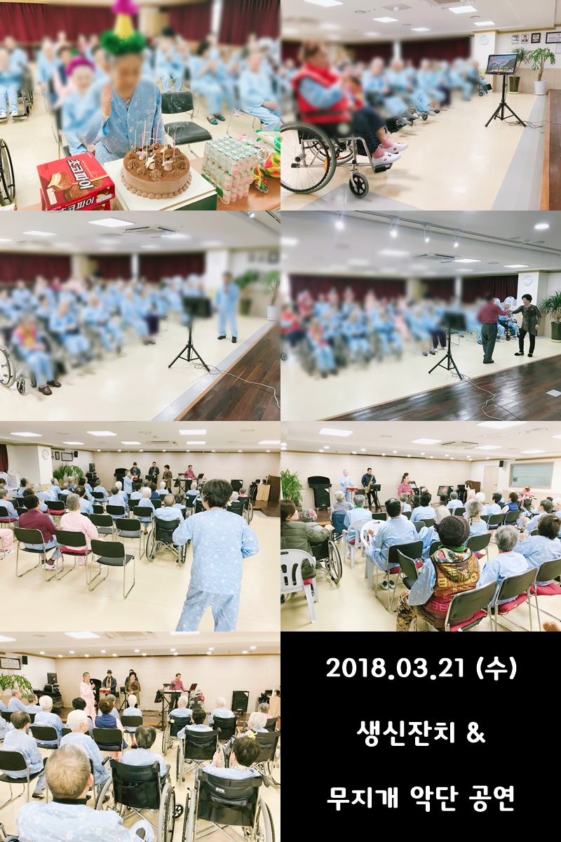 [병원 복지] 3월 생신잔치 및 무지개 악단 공연 본문 2018년 3월 21일 (수) 오후 2시에 본원 강당에서 3월 어르신 생신잔치와 함께 무지개 악단의 공연행사를 열었습니다. 생신을 맞이하신 어르신들과 축하해주시는 어르신들께서 노래와 춤을 추며 다함께 생신잔치와 공연을 즐길 수 있는 시간이였습니다. 어르신들께 즐거움과 웃음을 준 무지개 악단 단원 여러분들에게 다시 한번 감사 인사드립니다. 이전글 목록 다음글