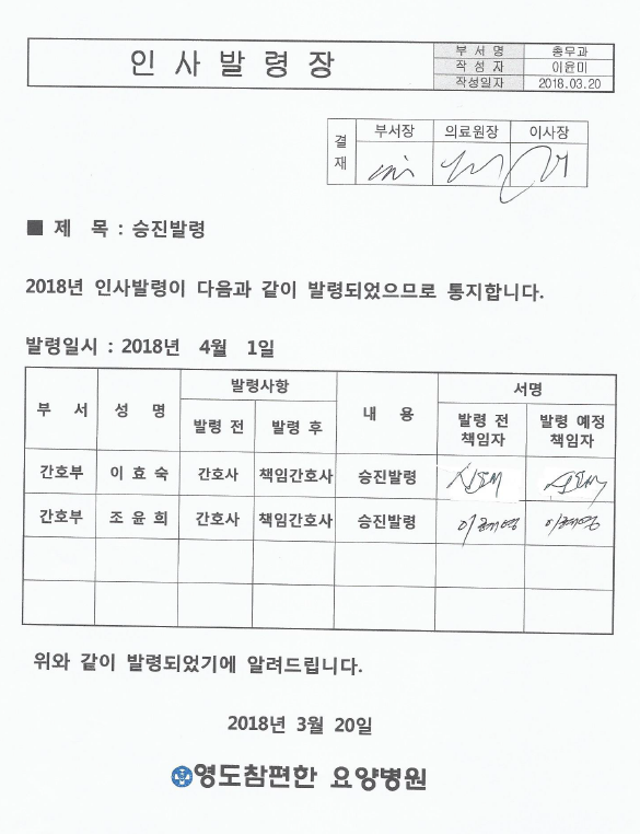 위와 같이 직원의 인사 발령을 공고합니다.