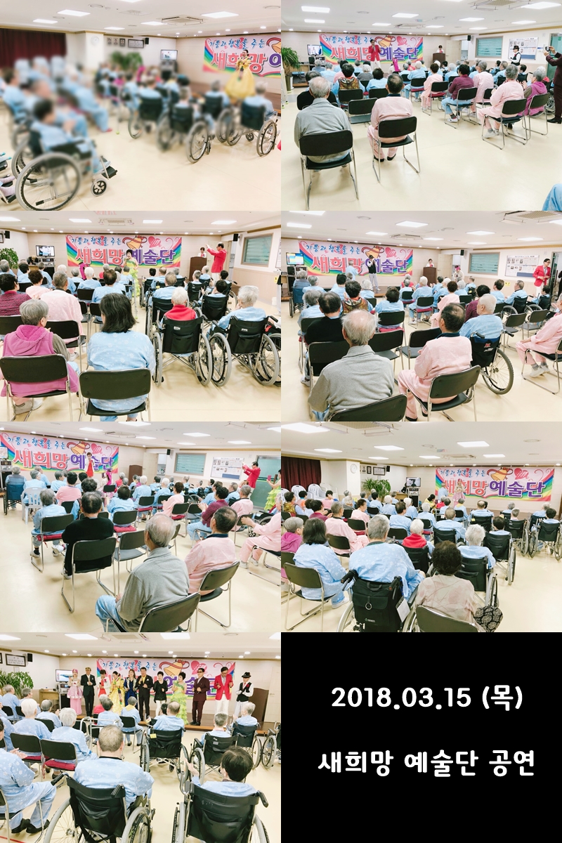 [병원복지] 3월 새희망 예술단 공연 본문 2018년 3월 15일 (목) 오늘은 새희망 예술단의 공연 행사가 있었습니다. 단원분들의 다양하고 신나는 노래(민요, 가요) 등 꾸며진 무대로, 어르신들이 한껏 흥이 나셨는지 춤과 박수를 치시며 즐거워하셨습니다. 즐겁게 해주신 새희망 예술단에게 다시한번 감사인사드립니다^^ 이전글 목록 다음글