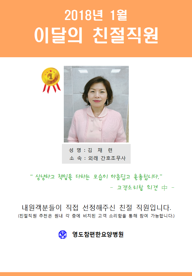 [안내] 2018년 1월 친절직원 선정 본문 우리 병원에서는 원내 각 층에 비치되어 있는 고객소리함을 통해 매달 친절 직원을 선정하고 있습니다. 최상의 의료서비스를 제공하기 위해 더욱 더 노력하는 영도참편한요양병원 직원들이 되겠습니다. 이전글 목록 다음글
