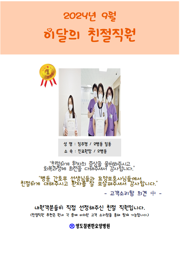[안내] 2024년 09월 친절직원 선정 본문 우리 병원에서는 원내 각 층에 비치되어 있는 고객소리함을 통해 매달 친절 직원을 선정하고 있습니다.최상의 의료서비스를 제공하기 위해 더욱 더 노력하는 영도참편한요양병원 직원들이 되겠습니다. 이전글 목록 다음글