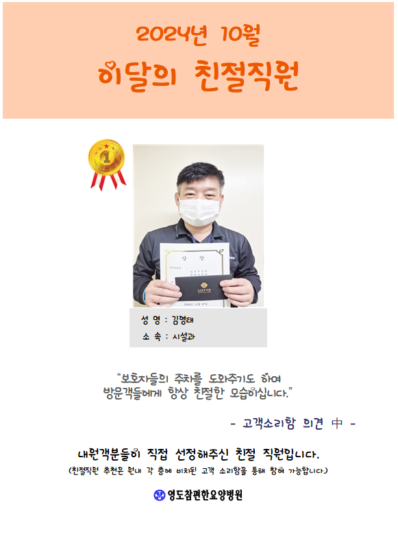[안내] 2024년 10월 친절직원 선정 본문 우리 병원에서는 원내 각 층에 비치되어 있는 고객소리함을 통해 매달 친절 직원을 선정하고 있습니다.최상의 의료서비스를 제공하기 위해 더욱 더 노력하는 영도참편한요양병원 직원들이 되겠습니다. 이전글 목록 다음글