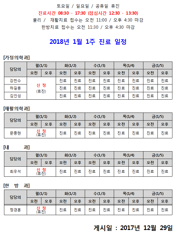 [안내] 1월 1주 진료 일정