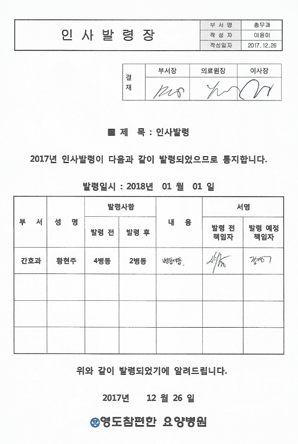 [안내] 직원인사발령 공고 본문 위와 같이 직원의 인사 발령을 공고합니다. 최상의 의료서비스를 제공하기 위해 더욱 더 노력하는 영도참편한요양병원 직원들이 되겠습니다. 이전글 목록 다음글