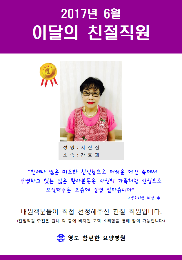 [안내] 2017년 6월 친절직원 선정 본문 우리 병원에서는 원내 각 층에 비치되어 있는 고객소리함을 통해 매달 친절 직원을 선정하고 있습니다. 최상의 의료서비스를 제공하기 위해 더욱 더 노력하는 영도참편한요양병원 직원들이 되겠습니다. 이전글 목록 다음글