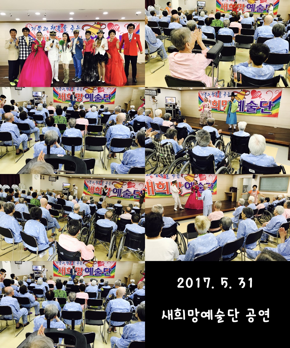 [병원복지] 5월 새희망 예술단 공연 본문 2017년 5월 31일 새희망 예술단의 공연 행사가 있었습니다. 단원분들의 다양한 공연(색소폰, 트럼펫등)들과 신나는 노래(민요, 가요), 각설이로 꾸며진 무대로, 어르신들이 한껏 흥이 나셨는지 춤과 박수를 치시며 즐거워하셨습니다. 즐겁게 해주신 새희망 예술단에게 다시한번 감사인사드립니다^^ 이전글 목록 다음글