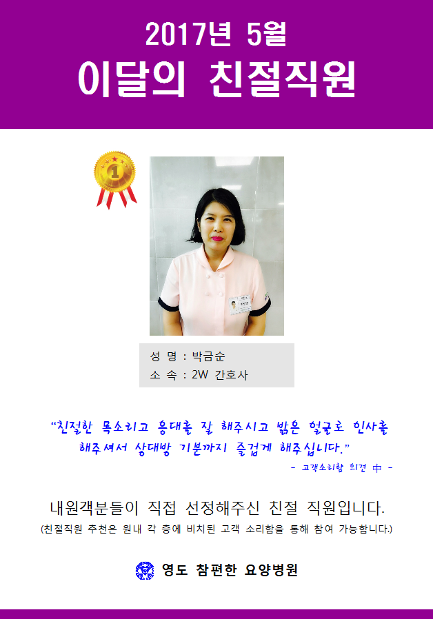 [안내] 2017년 5월 친절직원 선정 본문 우리 병원에서는 원내 각 층에 비치되어 있는 고객소리함을 통해 매달 친절 직원을 선정하고 있습니다. 최상의 의료서비스를 제공하기 위해 더욱 더 노력하는 영도참편한요양병원 직원들이 되겠습니다. 이전글 목록 다음글