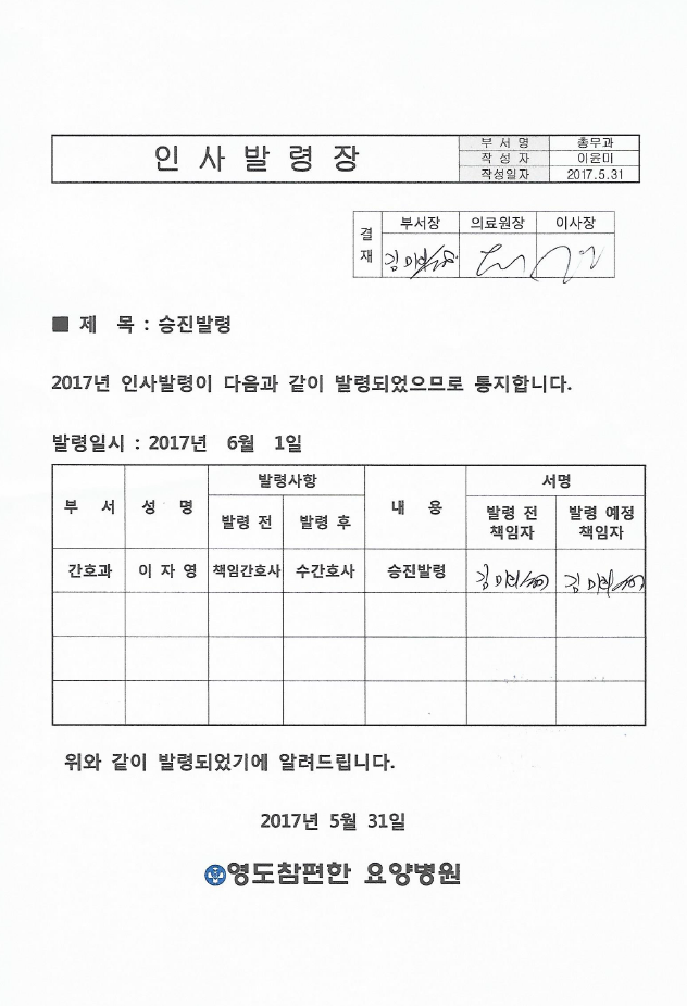 [안내] 직원 인사 발령 공고 본문 위와 같이 직원의 인사 발령을 공고합니다. 최상의 의료서비스를 제공하기 위해 더욱 더 노력하는 영도참편한요양병원 직원들이 되겠습니다. 이전글 목록 다음글