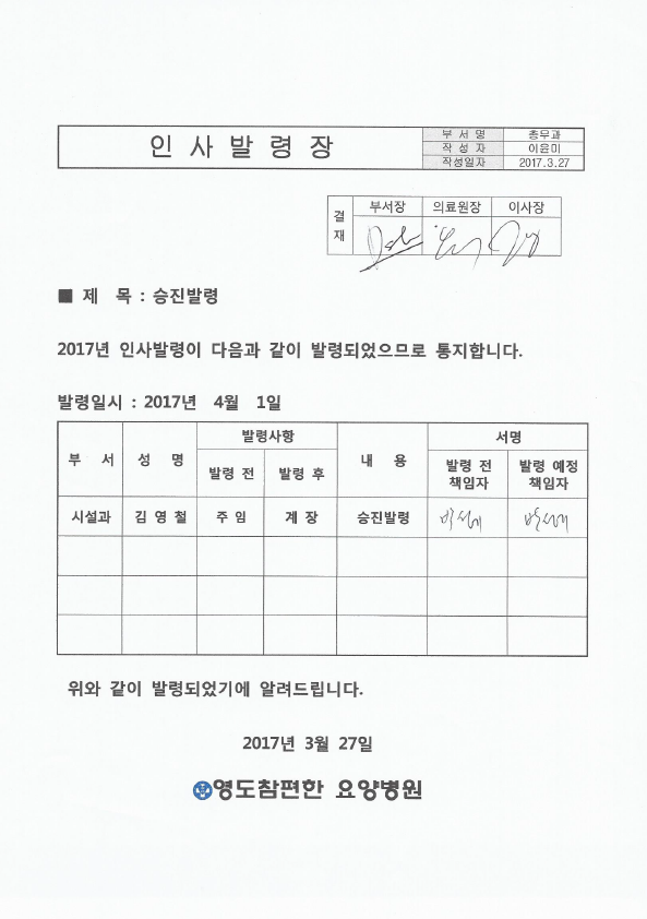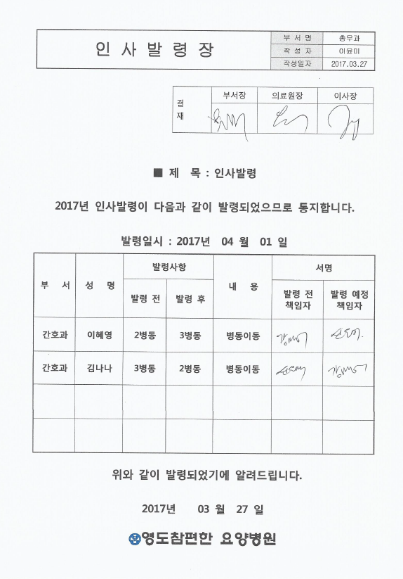 [안내] 직원 인사발령 공고 본문 위와 같이 직원의 인사 발령을 공고합니다. 최상의 의료서비스를 제공하기 위해 더욱 더 노력하는 영도참편한요양병원 직원들이 되겠습니다. 이전글 목록 다음글