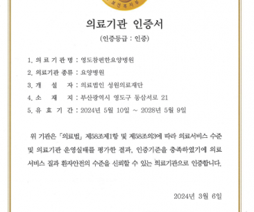 [안내] 영도참편한요양병원 의료기관 3주기 인증 획득