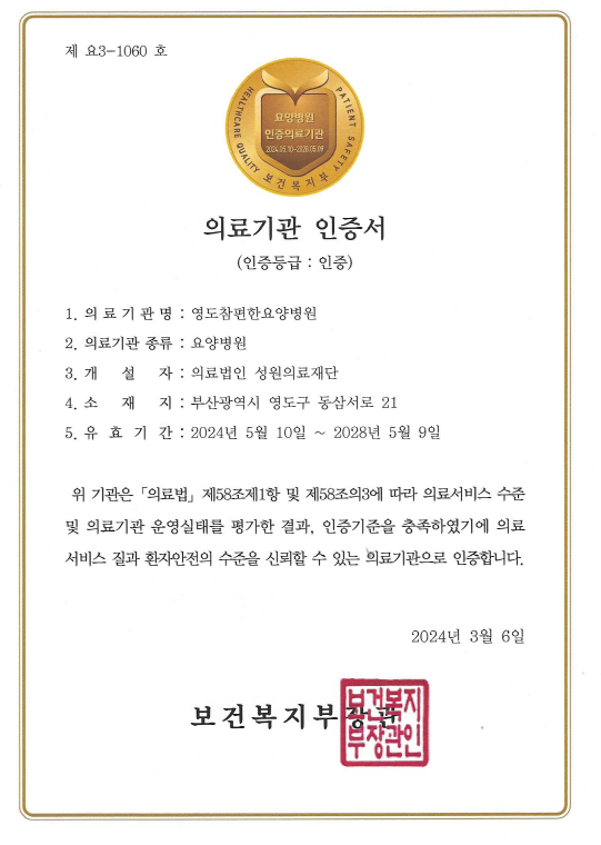 | [안내] 영도참편한요양병원 의료기관 3주기 인증 획득 | |||