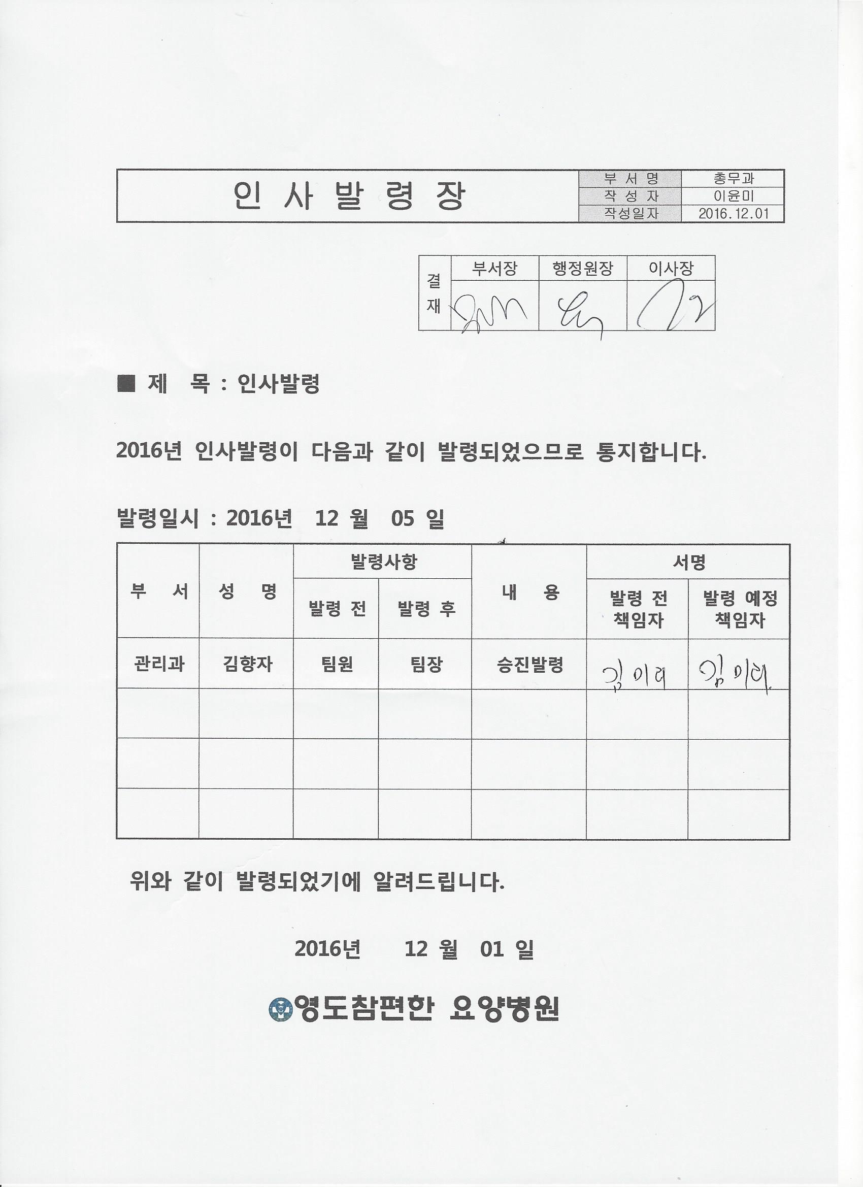 최상의 의료서비스를 제공하기 위해 더욱 더 노력하는 영도참편한요양병원 직원들이 되겠습니다.