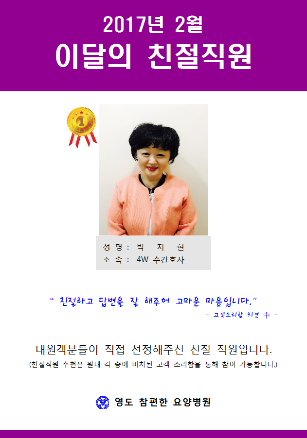 [안내] 2017년 2월 친절직원 선정 본문 우리 병원에서는 원내 각 층에 비치되어 있는 고객소리함을 통해 매달 친절 직원을 선정하고 있습니다. 최상의 의료서비스를 제공하기 위해 더욱 더 노력하는 영도참편한요양병원 직원들이 되겠습니다. 이전글 목록 다음글