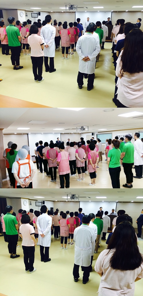 [안내] 2016년 7월 4일 아침조회 본문 2016년 7월 4일 아침조회를 실시하였습니다. 전직원이 함께 모여 인사와 진료원장님의 말씀 후 이사장님의 말씀을 들었습니다. 최상의 의료서비스를 제공하기 위해 더욱 더 노력하는 영도참편한요양병원 직원들이 되겠습니다. 이전글 목록 다음글