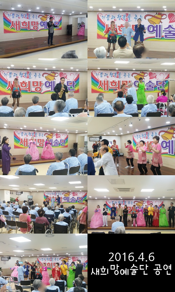 [병원복지] 4월 새희망예술단 공연 본문 2016년 4월 6일 새희망예술단의 공연이 있었습니다. 민요, 트럼펫, 색소폰, 가요 등 다양한 가수분들이 출연하셔서 어르신들을 즐겁게 해주셨습니다~ 어머님, 아버님들을 즐겁게 해주신 새희망 예술단에게 다시한번 감사인사드립니다^^ 이전글 목록 다음글