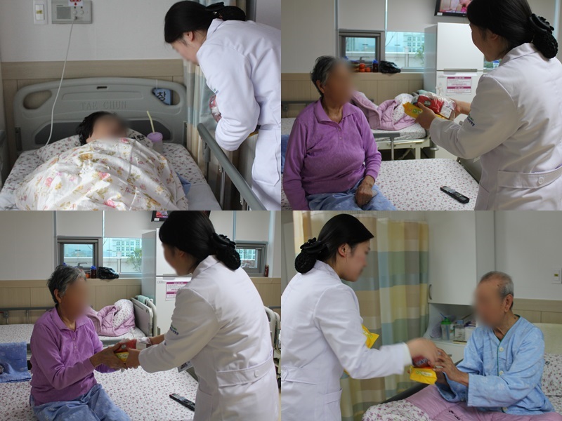 [병원복지] 2015년 12월 어르신 생신잔치 본문 2015년 12월 11일 (금) 오후 2시 30분에 12월 어르신 생신잔치를 열었습니다. 이번 생신잔치도 병원 사정으로 인해 어르신들을 모셔서 진행하지 못했습니다. 대신 병실에 따로 찾아갔으나 재활치료를 가셨거나 주무시고 계신 어르신들이 많으셔서 어르신들께 직접 선물과 간식을 전달해드리지 못한 경우가 대부분이었습니다.생신을 맞으신 어르신 분들에게 다시 한번 축하 인사 드립니다. 이전글 목록 다음글