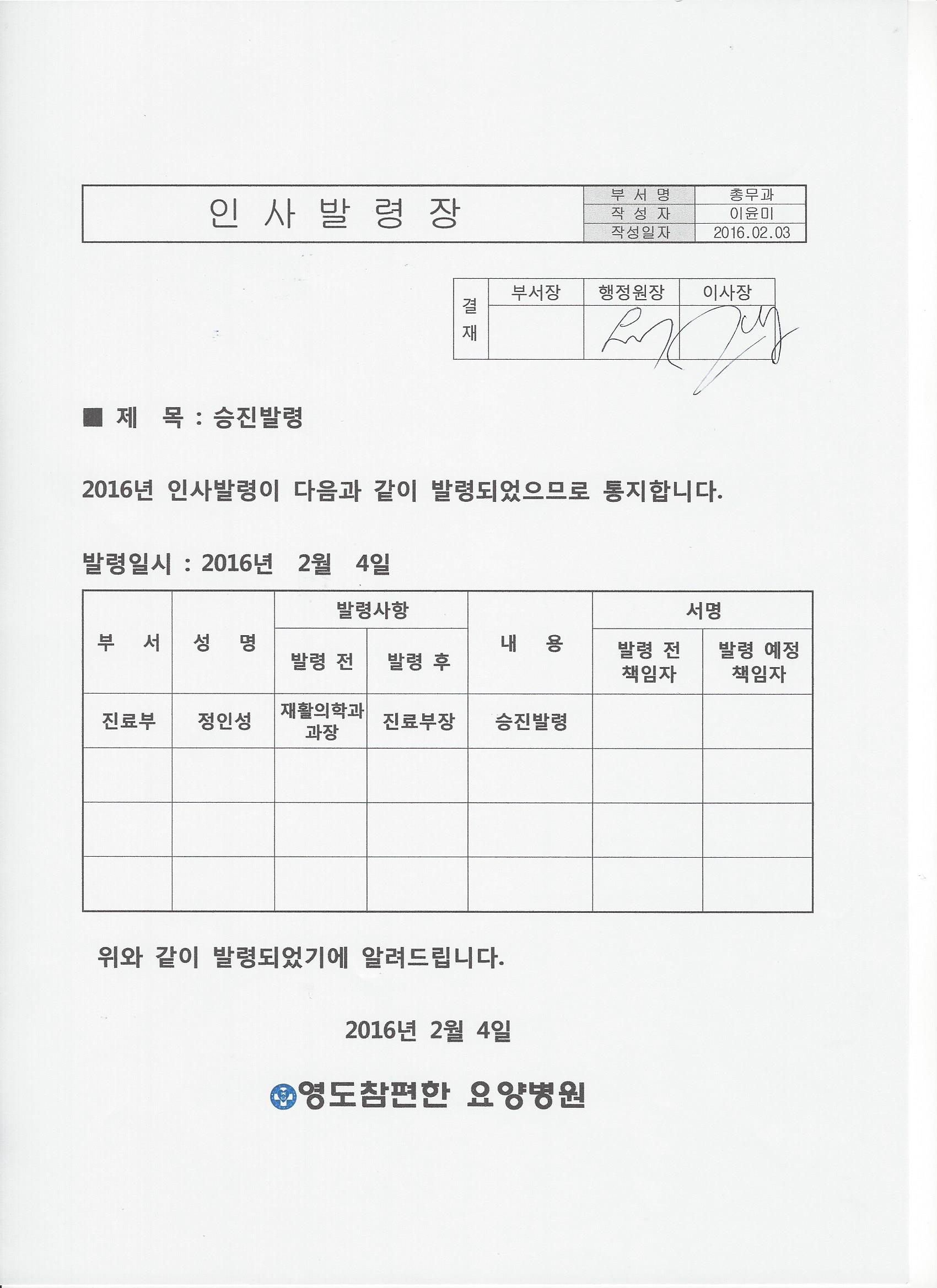 [안내] 의사 승진 발령 공고 본문 위와 같이 의사의 승진 발령을 공고합니다. 최상의 의료서비스를 제공하기 위해 더욱 더 노력하는 영도참편한요양병원 의사가 되겠습니다. 이전글 목록 다음글