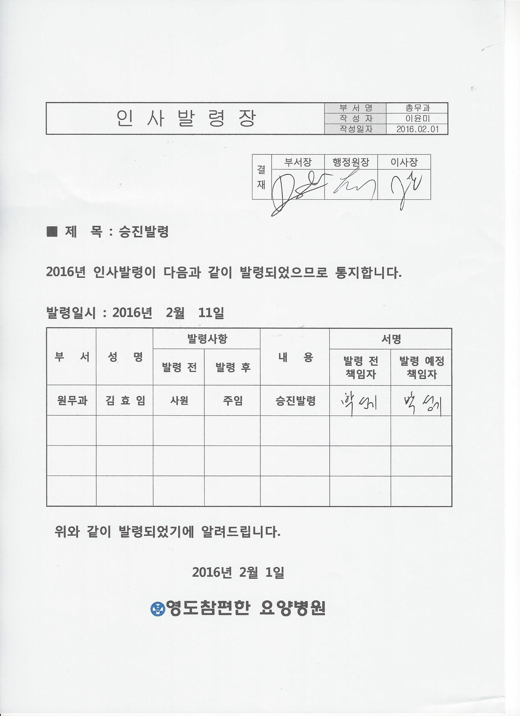 [안내] 직원 승진 발령 공고 본문 위와 같이 직원의 승진 발령을 공고합니다. 최상의 의료서비스를 제공하기 위해 더욱 더 노력하는 영도참편한요양병원이 되겠습니다. 이전글 목록 다음글