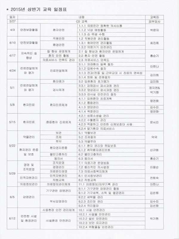 [안내] 2015년 상반기 직원교육 일정표 본문 2015년 3월 27일 부터 매주 금요일 오후 5시 20분부터 감천/영도 전 직원을 대상으로 하여 교육을 실시합니다. 위의 일정표를 참고하시길 바라며, 상기 일정은 병원 사정에 따라 변동이 될 수도 있습니다. 이전글 목록 다음글
