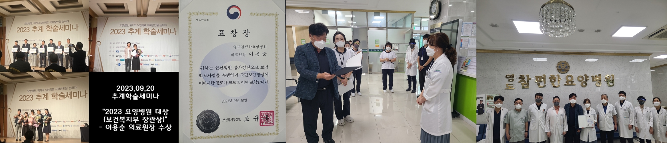 헌신적인 봉사정신으로 보건의료사업을 수행하여 국민보건향상에 이바지한 공로가 크므로 보건복지부장관 표창장을 수여받았습니다. 외부에서 수여식이 있었으나, 원내에서 한 번 더 진행하였습니다. 앞으로 더욱더 발전하는 영도참편한요양병원이 되겠습니다!