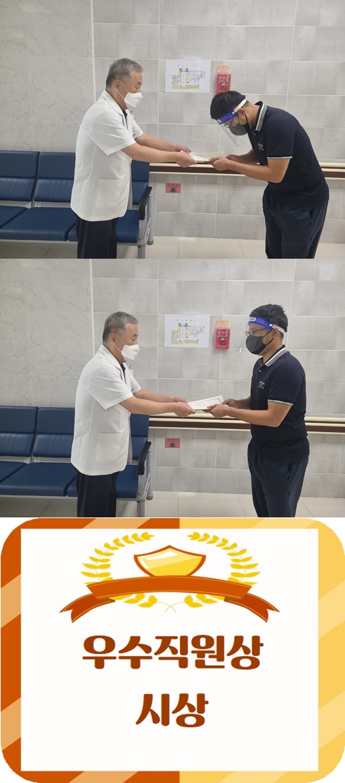 [안내] 2023년 10월 우수직원 선정 본문 영도참편한요양병원에서는 평소 품행이 바르고 업무에 투철한 책임감으로 병원의 발전에 도움을 준 직원을 선정하여 우수직원상 시상을 하였습니다. 병원장님께서 시상을 도와주셨고 우수직원으로 선정된 직원은 상장과 부상을 받으셨습니다. ^^ 우수직원 : 재활치료실장 이종현 이전글 목록 다음글