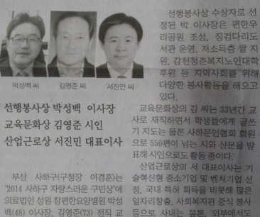 [안내] 박성백 이사장, 2014 사하구 자랑스러운 구민상 '선행봉사상' 수상