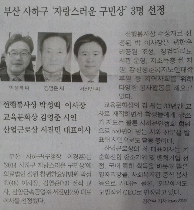 | [안내] 박성백 이사장, 2014 사하구 자랑스러운 구민상 '선행봉사상' 수상 | |||
