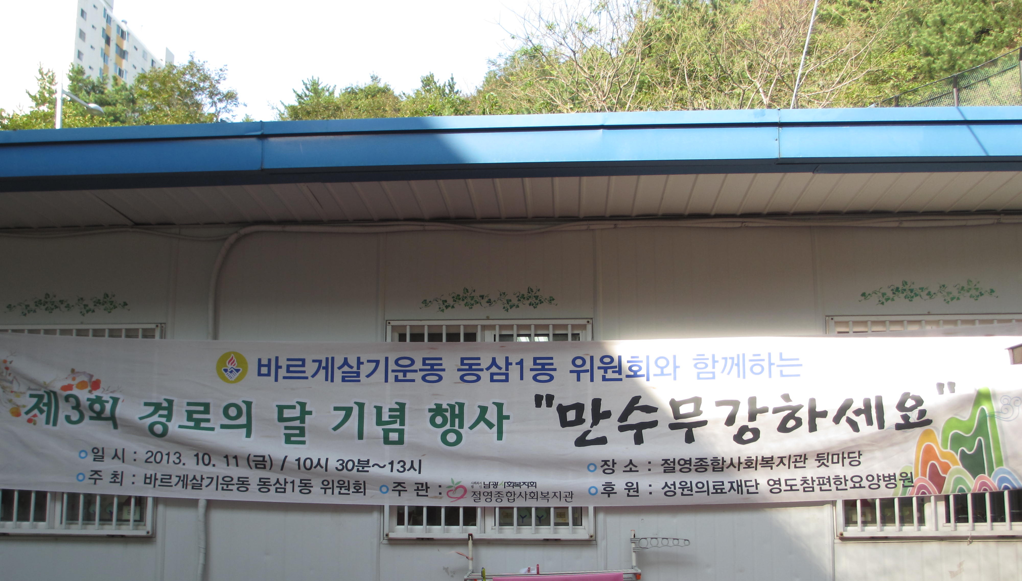 [지역복지] 2013년 경로의 달 기념행사 후원 본문 의료법인 성원 영도참편한요양병원에서는 2013년 10월 11일(금) 바르게살기운동 동삼1동 위원회에서 주최하는 2013년 경로의 달 기념행사에 물품 후원, 참여하였습니다. 언제나 지역주민과 함께하는 영도참편한요양병원이 되겠습니다. 이전글 목록 다음글