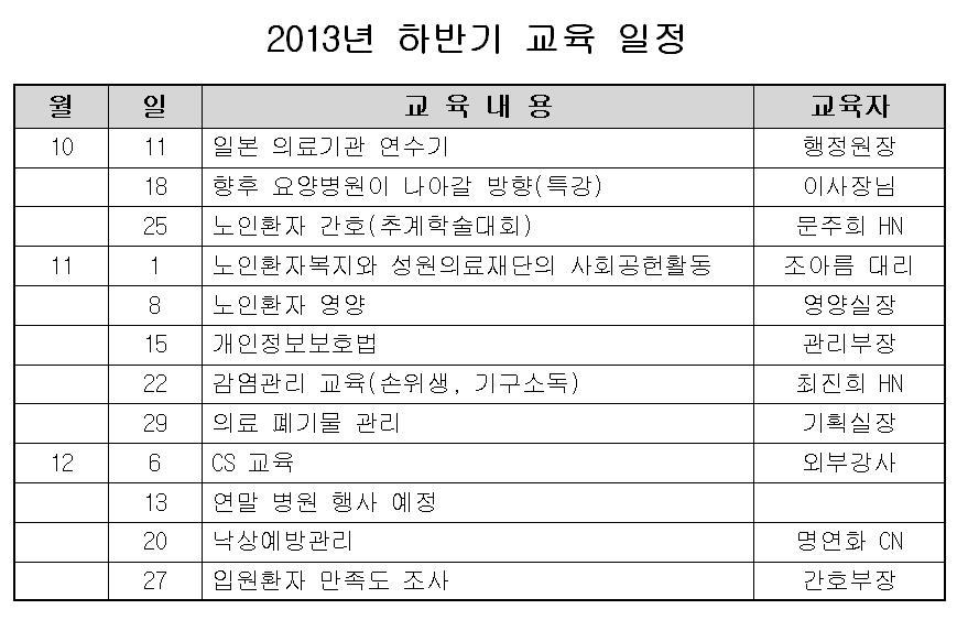 [직원교육] 2013년 하반기 교육 일정 본문 2013년 하반기 직원교육 일정이 나왔습니다. 병원 사정에 따라 일정이 변경될 수 있습니다. 교육에 빠짐없이 참석하여 발전하는 병원이 되도록 노력합시다. 이전글 목록 다음글