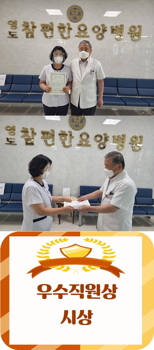 [안내] 2023년 06월 우수직원 선정 본문 영도참편한요양병원에서는 평소 품행이 바르고 업무에 투철한 책임감으로 병원의 발전에 도움을 준 직원들을 선정하여 우수직원상 시상을 하였습니다. 우수직원 대표로 2병동 수간호사 박금순선생님께서 상장과 부상을 받으셨습니다. ^^ 우수직원 : 2병동 수간호사 박금순 2병동 간호사 박정은 2병동 간호조무사 김미수 이전글 목록 다음글
