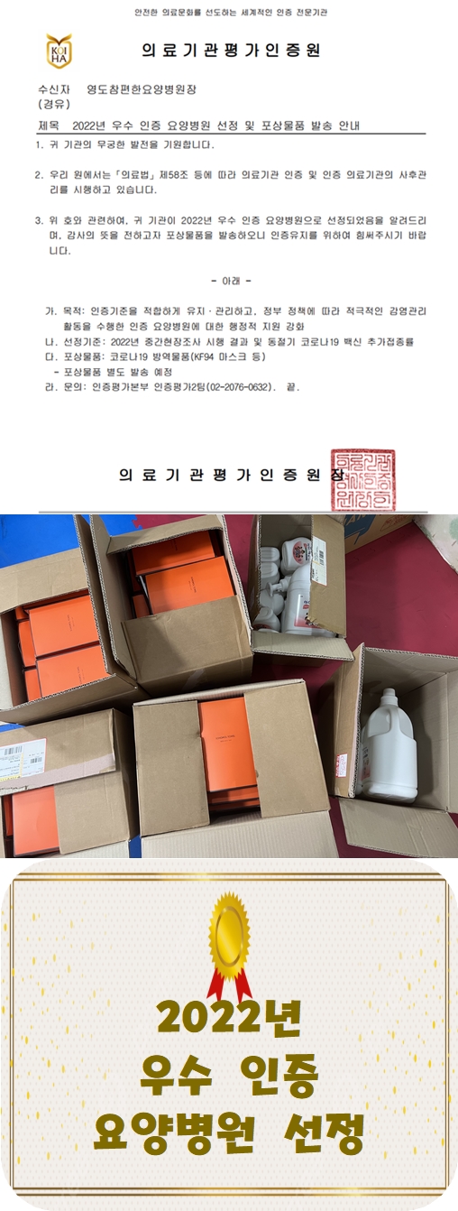 [안내] 2022년 우수 인증 요양병원 선정 본문 저희 영도참편한요양병원이 2022년 중간현장조사 시행 결과 및 동절기 코로나19 백신 추가접종률 등의 선정기준에 따라2022년 우수 인증 요양병원으로 선정되어 포상물품을 받았습니다.적극적인 감염관리에 힘쓰며 항상 노력하는 영도참편한요양병원이 되겠습니다. 이전글 목록 다음글