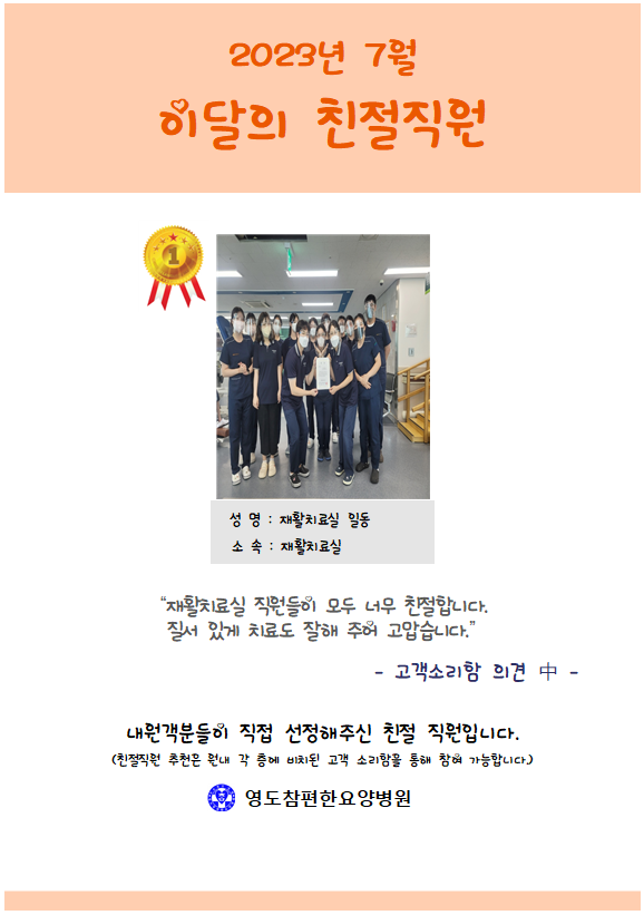 [안내] 2023년 07월 친절직원 선정 본문 우리 병원에서는 원내 각 층에 비치되어 있는 고객소리함을 통해 매달 친절 직원을 선정하고 있습니다.최상의 의료서비스를 제공하기 위해 더욱 더 노력하는 영도참편한요양병원 직원들이 되겠습니다. 이전글 목록 다음글