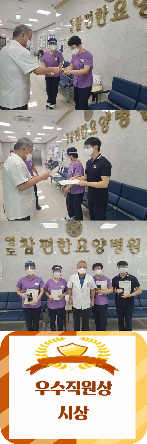 [안내] 2023년 09월 우수직원 선정 본문 영도참편한요양병원에서는 평소 품행이 바르고 업무에 투철한 책임감으로 병원의 발전에 도움을 준 직원들을 선정하여 우수직원상 시상을 하였습니다. 병원장님께서 시상을 도와주셨고 우수직원으로 선정된 직원들은 상장과 부상을 받으셨습니다. ^^ 우수직원 : 2병동 간호조무사 최은자 2병동 간호조무사 한재란 4병동 간호조무사 김경숙 재활치료실 이승근 이전글 목록 다음글