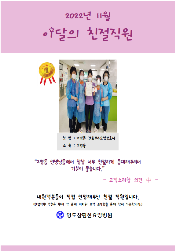 우리 병원에서는 원내 각 층에 비치되어 있는 고객소리함을 통해 매달 친절 직원을 선정하고 있습니다.