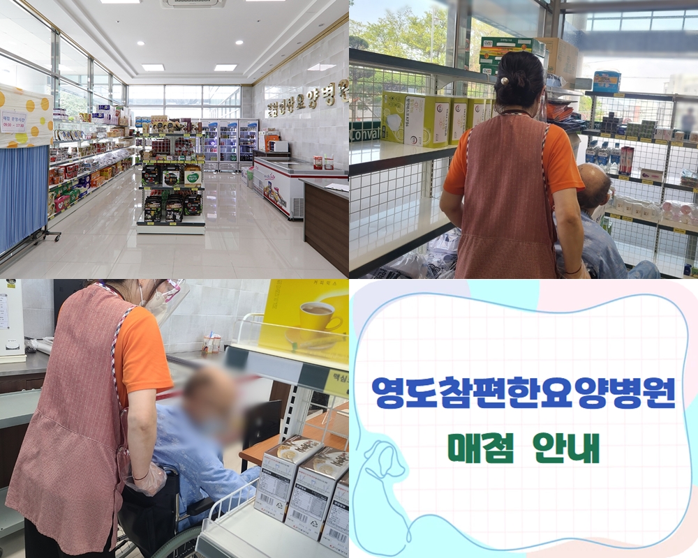저희 영도참편한요양병원 원내에는 환자 및 보호자분들께서 이용할 수 있는 매점이 있습니다. 환자분들께서 좋아하시는 간식, 차, 두유 등이 구비되어 있고, 본원에서 지내시면서 필요한 물티슈, 빨대컵, 마스크, 에어매트 등이 판매되고 있습니다. 환자 및 보호자분들이 필요한 것을 쉽게 구매하실 수 있도록 매점을 활성화하고 있으니 언제든 편하게 이용 바랍니다. |