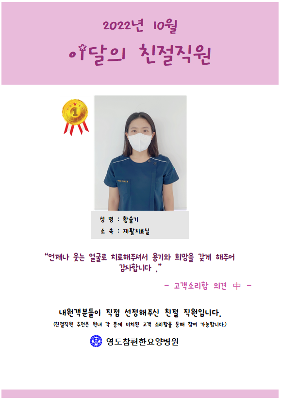 [안내] 2022년 10월 친절직원 선정 본문 우리 병원에서는 원내 각 층에 비치되어 있는 고객소리함을 통해 매달 친절 직원을 선정하고 있습니다.최상의 의료서비스를 제공하기 위해 더욱 더 노력하는 영도참편한요양병원 직원들이 되겠습니다. 이전글 목록 다음글