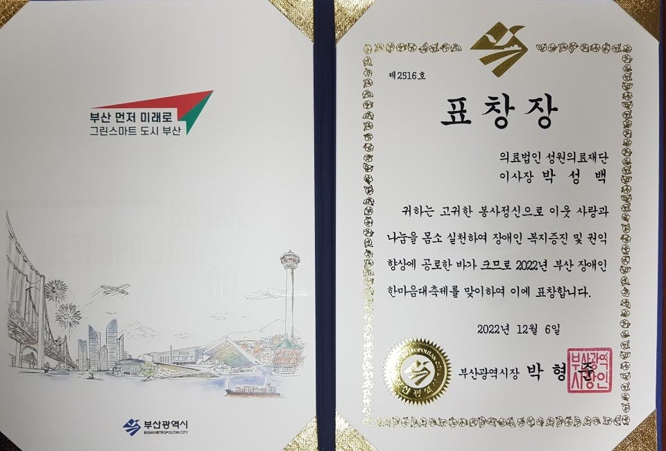 [안내] 2022년 부산 장애인 한마음대축제 박성백 이사장 표창장 수상 본문 일시 : 2022년 12월 6일 고귀한 봉사정신으로 이웃 사랑과 나눔을 몸소 실천하여 장애인 복지증진 및 권익향상에 공로한 바가 크므로 2022년 부산 장애인 한마음대축제를 맞이하여 박성백 이사장님께서 표창장을 받았습니다. 이전글 목록 다음글
