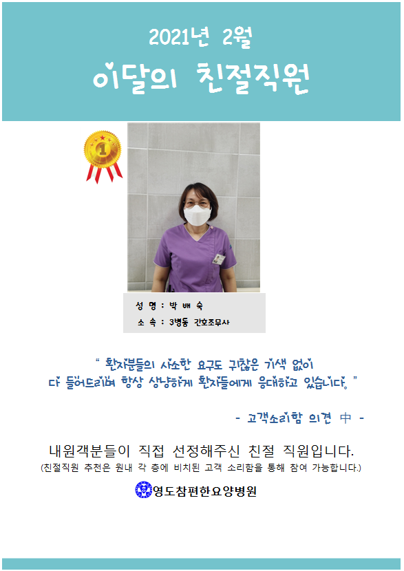 [안내] 2021년 2월 친절직원 선정 본문 우리 병원에서는 원내 각 층에 비치되어 있는 고객소리함을 통해 매달 친절 직원을 선정하고 있습니다. 최상의 의료서비스를 제공하기 위해 더욱 더 노력하는 영도참편한요양병원 직원들이 되겠습니다. 이전글 목록 다음글