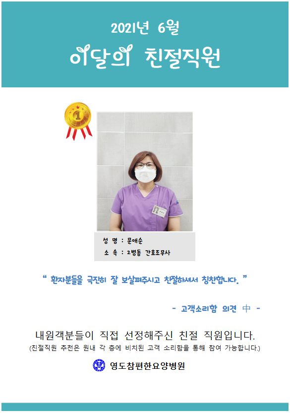 [안내] 2021년 6월 친절직원 선정 본문 우리 병원에서는 원내 각 층에 비치되어 있는 고객소리함을 통해 매달 친절 직원을 선정하고 있습니다. 최상의 의료서비스를 제공하기 위해 더욱 더 노력하는 영도참편한요양병원 직원들이 되겠습니다. 이전글 목록 다음글