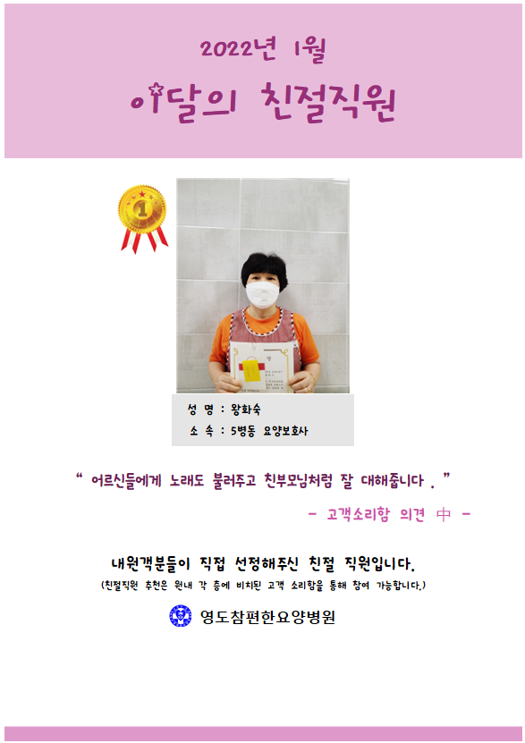 [안내] 2022년 1월 친절직원 선정 본문 우리 병원에서는 원내 각 층에 비치되어 있는 고객소리함을 통해 매달 친절 직원을 선정하고 있습니다.최상의 의료서비스를 제공하기 위해 더욱 더 노력하는 영도참편한요양병원 직원들이 되겠습니다. 이전글 목록 다음글
