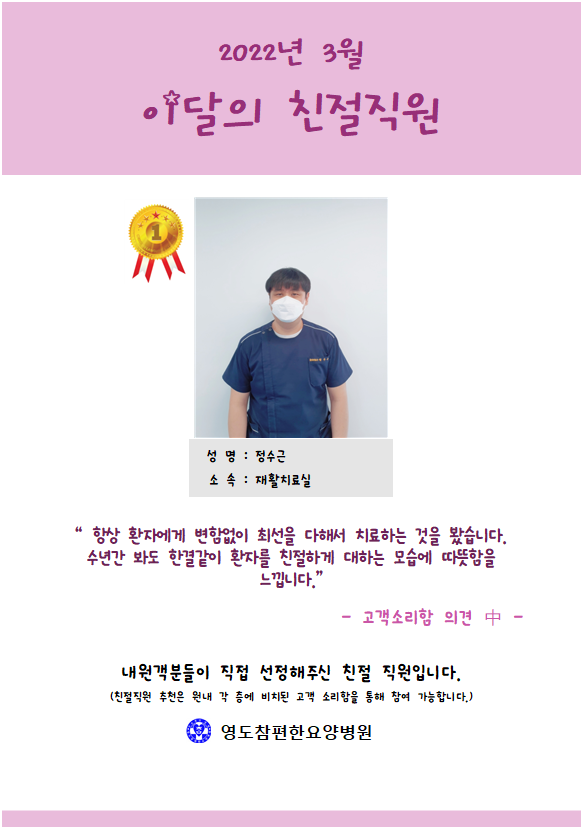 [안내] 2022년 3월 친절직원 선정 본문 우리 병원에서는 원내 각 층에 비치되어 있는 고객소리함을 통해 매달 친절 직원을 선정하고 있습니다.최상의 의료서비스를 제공하기 위해 더욱 더 노력하는 영도참편한요양병원 직원들이 되겠습니다. 이전글 목록 다음글